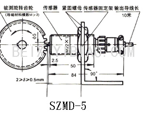 SZMB-5型磁电转换传感器,能将转角位移转换成电信号供计数器使用。非接触就能测量各种导磁材料如:齿轮、叶轮、带孔(或槽、螺钉)圆盘(或轴)的转速及线速度。