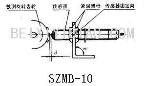 SZMB—10磁电转速传感器能将转角位移转换成电信号供计数器计数。非接触就能测量各种导磁材料如:齿轮、叶轮、带孔(或槽、螺钉)圆盘(或轴)的转速及线速度。