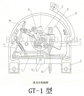 仪表的结构,主要以钢板1为测力元件,当张紧之钢索卡在二端止动块2为支点,卡块3为力点之间,钢索的张力则推动卡块使钢板弯曲变形,通过推杆4拉动扇形齿轮5传动齿轴6端部的指针7在度板8上回转,指示出相应读数,弹簧片9压在扇形齿轮的边缘上,推杆4是在套管10内单向运动的,当张力计从钢索上取下时,使指针留在读数上,用开关棒11抬起弹簧片9即可使指针7回复到零。张力计的机件是安装在铝合金的外壳内。
