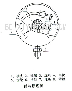 仪表的测量系统由接头与弹簧组成,由于被测压力的变化,使弹簧管自由端产生位移,借连杆带动扇轮传动齿轮端部的指针旋转,在度板上指示相应的数值为了消除扇轮齿轮与转轴齿轮间的间隙,在转轴齿轮上装置了盘形游丝。