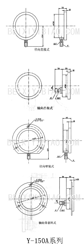 60、61、63分别表示公制规格的外壳直径为62mm的径向直接式,轴向凸装式和64mm轴向嵌装式(有表环式及固定架式两种)2½"表示英制规格的外壳直径为62或64mm。100,101,102,103分别表示外壳直径为100mm径向直接式,轴向凸装式,径向带后表环式和轴向嵌装式(有表环式及固定架式两种);4"表示英制规格的外壳直径 |