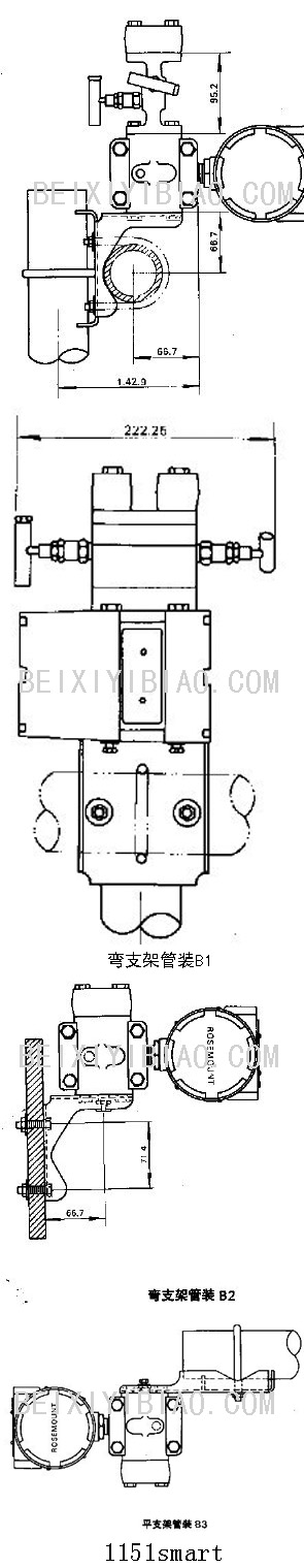 范围代号3、4、5的变送器,其两个连接接头上的螺孔为1/2-14NPT,两个接头翻转安装,使两安装接头螺孔的中心距获得三种尺寸:50.8mm,54mm和57.2mm