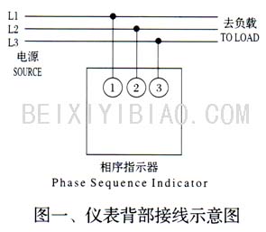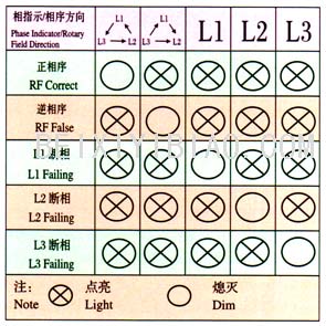 2、当接通电源后,各相所对应的指示灯点亮,如有缺相时对应此相的指示灯会熄灭,且正序与逆序指示灯同时点亮