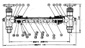 1. 阀门2.下接头3.密封垫圈(钢纸)4.下压紧螺母5.上压紧螺母6.垫圈(钢板)7.上接头8.阀门9.玻璃管10、 11.左右标尺12.保护套13、 14、 15.拉紧螺杆、螺母、光垫圈16、 17、 18.十字槽平圆螺钉、垫圈、螺母19.压紧套筒20、 21、 22.十字平槽圆螺钉、螺母、垫圈23.夹头24.护板 25.密封垫圈