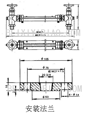 仪表在上下阀上都装有M27×1.5或ZG3/4″的螺纹接头,通过法兰也容器连接的构成连通器,透过玻璃管可直接读得容器内液位的高度。