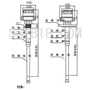 3.在测粉末和颗粒装物料时,可以水平或垂直安装,但探头穿过容器时,保护电极应比容器壁上的积料厚度长出2〞。