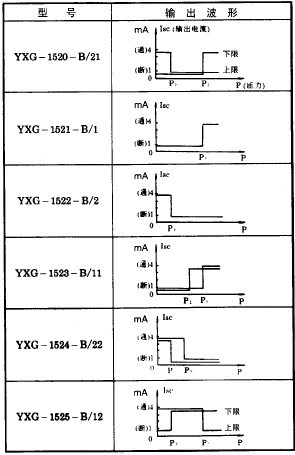 本仪表的接点形式为感应式接点开关,是由安装在上、下限设定针上的感应开关及信号针组成。其关键器件—感应开关由德国的“p+f”制造。接点发出位式信号的工作原理以YXG-1520-B/21为例加以说明:当压力为零时,上限接点输出为小于1mA的断态信号,下限接点输出为大于3mA的通态信号。当压力上升到达下限值时,下限信号针进入下限感应开关的缝隙中,使下限感应开关电器状态改变,下限接点输出立即跳变成小于1mA的断态信号。当压力上升到达上限值时,上限信号针被带离上限感应开关的缝隙,使上限感应开关的电器状态改变,上限接点输出立即跳变成大于3mA的通态信号。压力继续上升,信号保持。当压力回落至上限值时,上限信号又插回上限感应开关的缝隙中,上限感应开关又回复原来的状态,使上限接点输出跳变回小于1mA的断态信号。压力继续下降,信号保持。当压力下降至下限值时,下限信号针又被带离下限感应开关的缝隙,下限感应开关又回复原来的状态,使下限接点输出跳变回大于3mA的通态信号。
