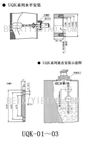 UQK-01、02安装法兰通径不得小于Φ80,以免浮球进不了容器造成无法安装的后果。 单位:mm